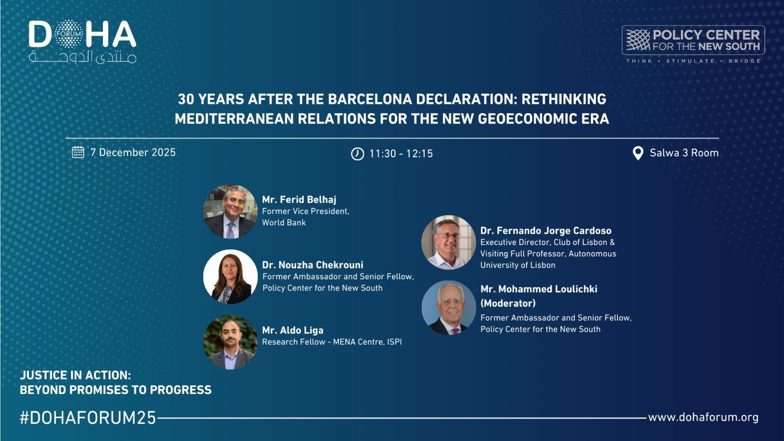 Titled “30 Years After the Barcelona Declaration: Rethinking Mediterranean Relations for the New Geoeconomic Era”, this session is scheduled for December 7, 2025 from 11:30 to 12:15 (Doha time) and aims to explore whether — and how — the Mediterranean can be reinvented as a strategic space of collective agency, innovation, and resilience in a rapidly evolving geoeconomic environment.