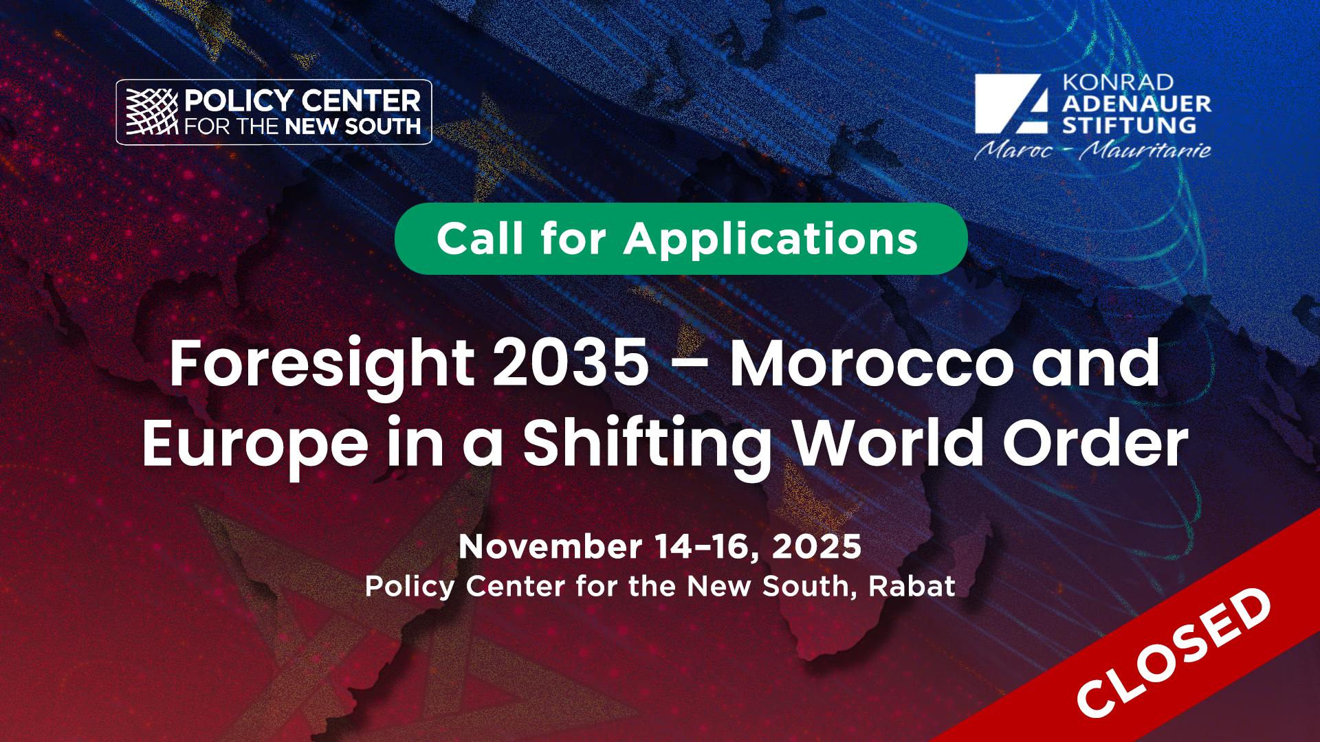 The Policy Center for the New South (PCNS) and Konrad Adenauer Stiftung Morocco are pleased to launch applications for the policy simulation Foresight 2035 – Morocco and Europe in a Shifting World Order, taking place on November 14–16, 2025, at PCNS, in Rabat.
