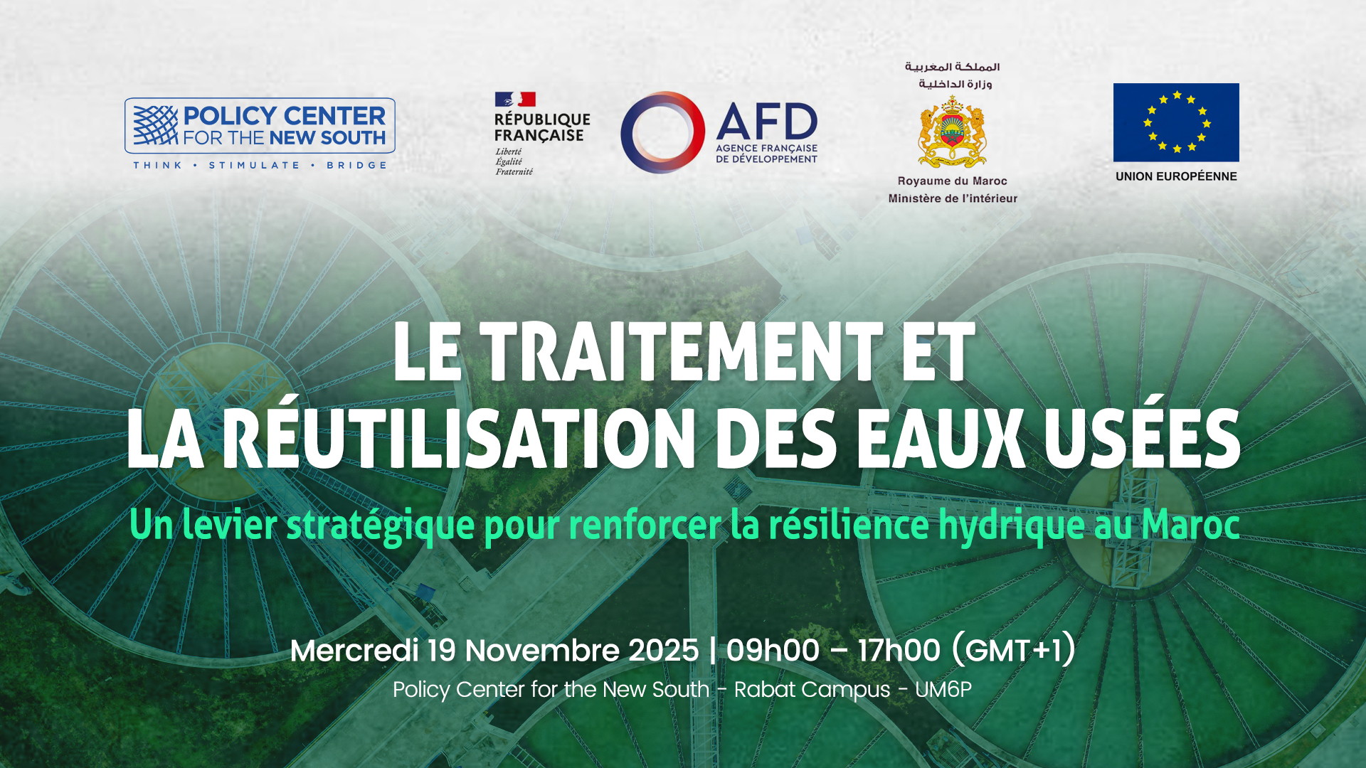 Le Policy Center for the New South (PCNS), en partenariat avec le ministère de l’Intérieur et l’Agence Française de Développement (AFD), coorganise un événement intitulé : « Le traitement et la réutilisation des eaux usées : un levier stratégique pour renforcer la résilience hydrique au Maroc », qui se tiendra le 19 novembre 2025 dans les locaux du PCNS à Rabat.