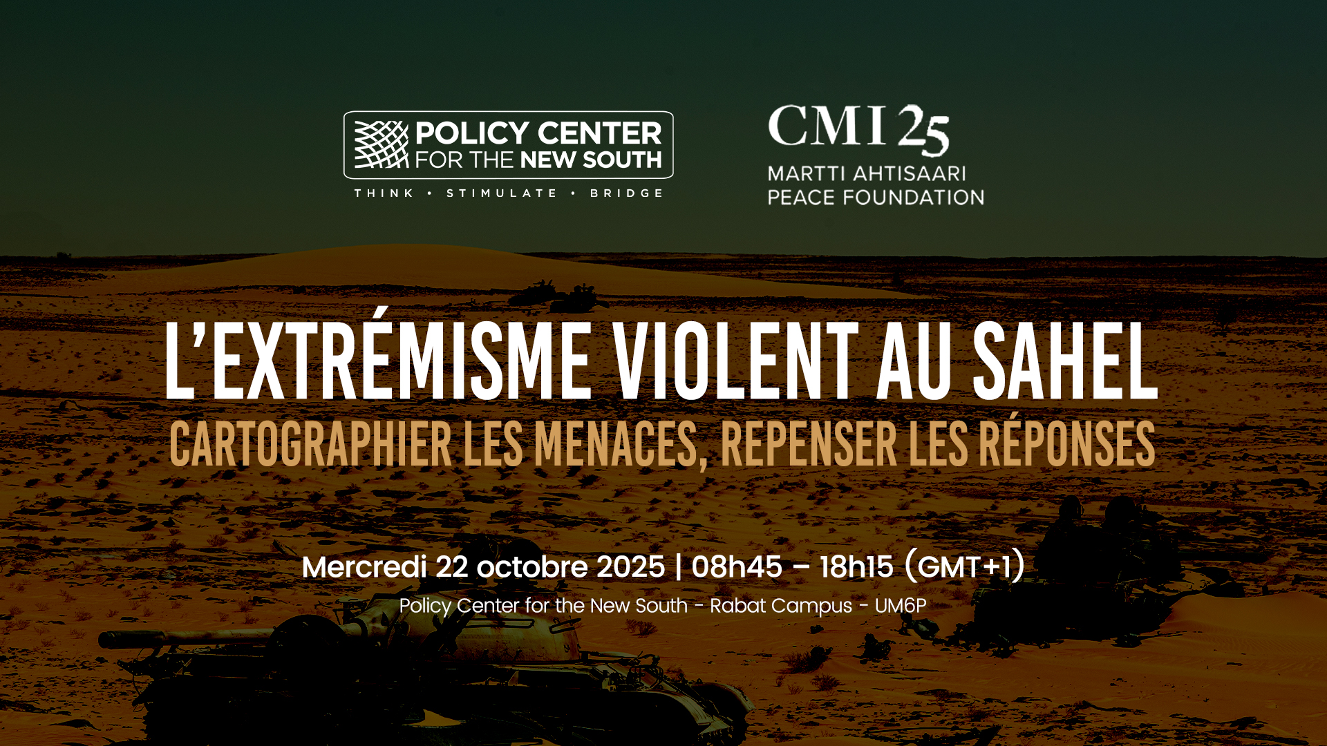 Le Policy Center for the New South et le CMI – Martti Ahtisaari Peace Foundation organisent une table ronde fermée le mercredi 22 octobre 2025 consacrée à l’évolution des menaces au Sahel et aux réponses à y apporter. La région connaît une intensification et une extension des violences menées par des groupes armés non étatiques, mettant à l’épreuve les capacités de réponse des États et soulignant les limites des approches uniquement sécuritaires. Cette rencontre vise à analyser l’expansion territoriale et opérationnelle des groupes extrémistes, à comprendre l’évolution de leurs tactiques hybrides et à explorer des réponses intégrées, alliant sécurité, services publics, dialogue communautaire et communication stratégique, afin de renforcer durablement la résilience des États et des populations face à ces dynamiques.