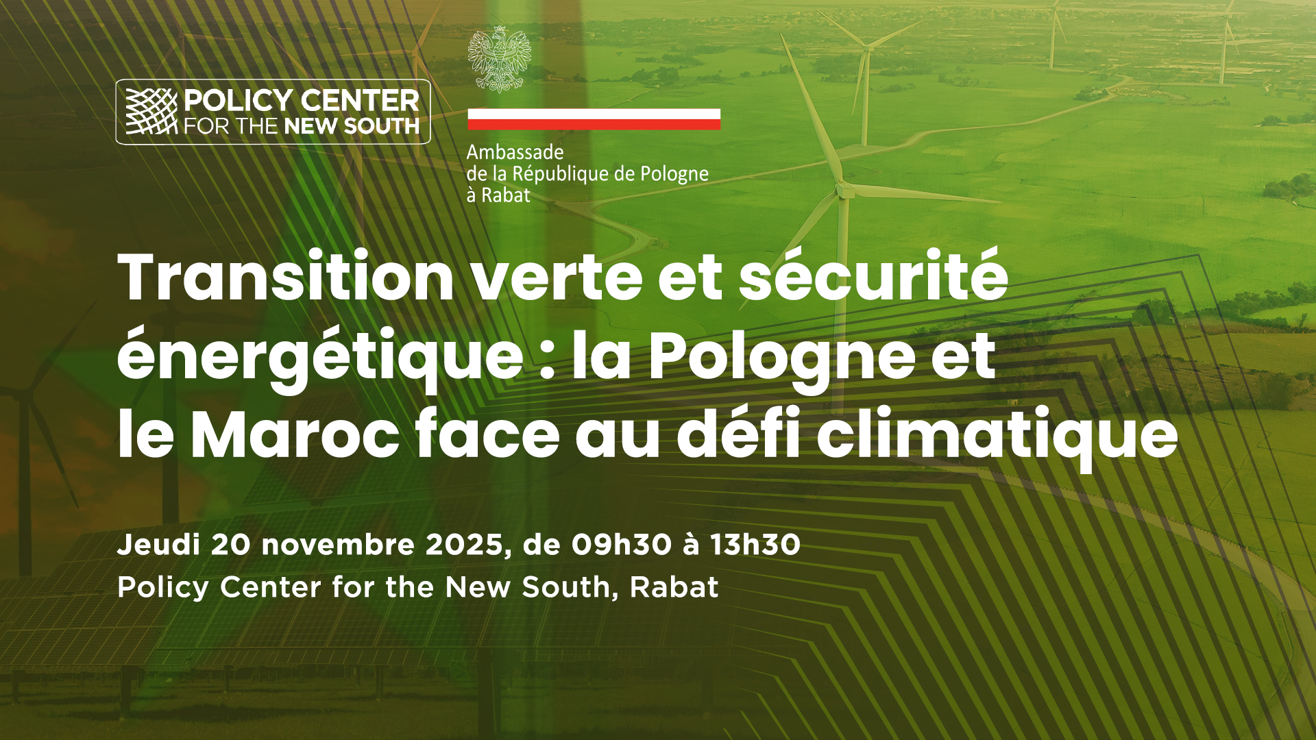 Le Policy Center for the New South (PCNS) et l’Ambassade de Pologne au Maroc coorganisent une rencontre intitulée « Transition verte et sécurité énergétique : la Pologne et le Maroc face au défi climatique », visant à croiser les expériences et les priorités des deux pays afin d’identifier des synergies concrètes dans les domaines de la politique énergétique, de l’hydrogène vert, de la recherche et de la formation.