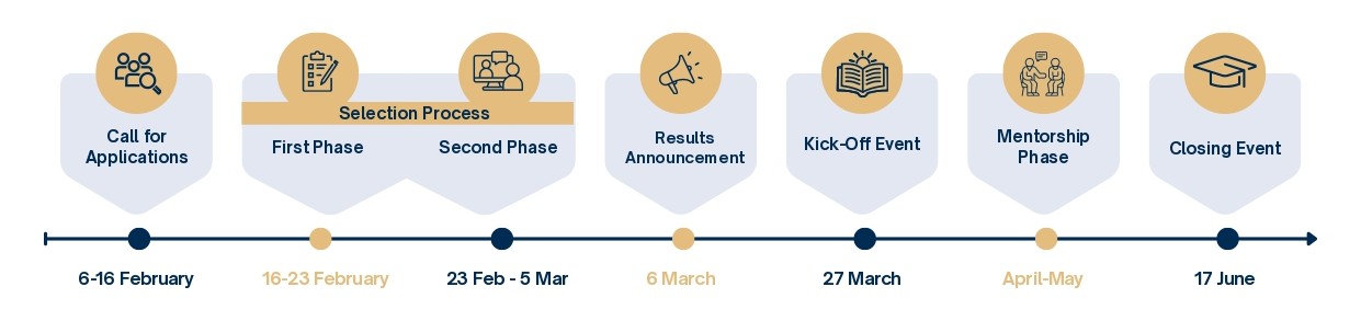 During the mentorship phase (April–May), mentees will follow a structured research and drafting pathway, including a minimum of five mentorship meetings. Each mentee will be supported by two mentors, one PCNS Senior Fellow and one PCNS Expert, providing close guidance throughout the process and leading to the completion of a policy brief, which may be drafted in Arabic, French, or English.