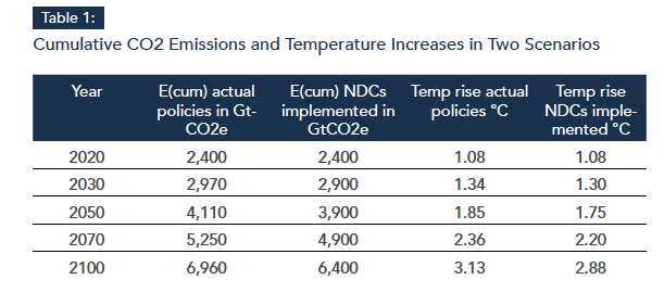 All plausible future scenarios based on current policies, as well as those based on actual promises by countries to implement stronger mitigation measures, indicate a continuous increase in temperatures to about 3°C, or even more, by the end of the century. Table 1 sets out two scenarios using data on new net emissions from UNEP’s 2024 Emissions Gap Report, and a cumulative emissions figure for 2020 of 2,400 Gt of CO2 from the IPCC report (see above). The TCRE used is the midpoint estimate from the IPCC report (0.45). The first scenario (actual policies) uses the same assumption as UNEP (2024) that net emissions continue to increase by about 57 Gt of CO2 every year. As shown in Table 1, this implies a global temperature increase approaching 2°C by 2050 and exceeding 3°C by 2100. If countries actually implement all their emissions pledges, as set out in their nationally determined contributions (NDCs), net emissions would, according to UNEP, decline to about 50 GtCO2e annually. As shown in the table this would lead to only a marginal improvement, as the temperature increase by 2100 would reach 2.88°C instead of 3.13°C (Table 1)[1].