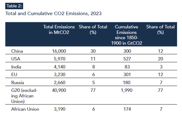 The evolution of the stock of emissions is largely beyond the control of Africa. As shown in Table 2, all 54 African Union countries are responsible for only 7% of cumulative emissions. That should be compared to 20% for the U.S., and 12% for both China and the European Union (EU). Africa’s share of new emissions is only 6%. That is lower than India (8%), the U.S. (11%), and China (30%). The picture is even more striking if one looks at emissions per capita. Africa’s per-capita emissions were 2.2 tCO2 in 2023, compared to 19 tCO2 for Russia, 18 tCO2 for the U.S., 11 tCO2 for China, 7.2 tCO2 for the EU, and 2.9 tCO2 for India.