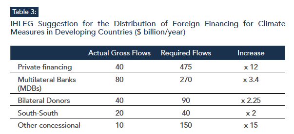 Table 3 compares the actual level of international climate financing flowing to developing countries (excluding China) with the levels that the IHLEG believes is necessary. It should be noted that actual climate financing flowing to developing countries now is only around $190 billion, which means that the IHLEG assumes a more than five-fold increase in foreign financing to reach $1 trillion.