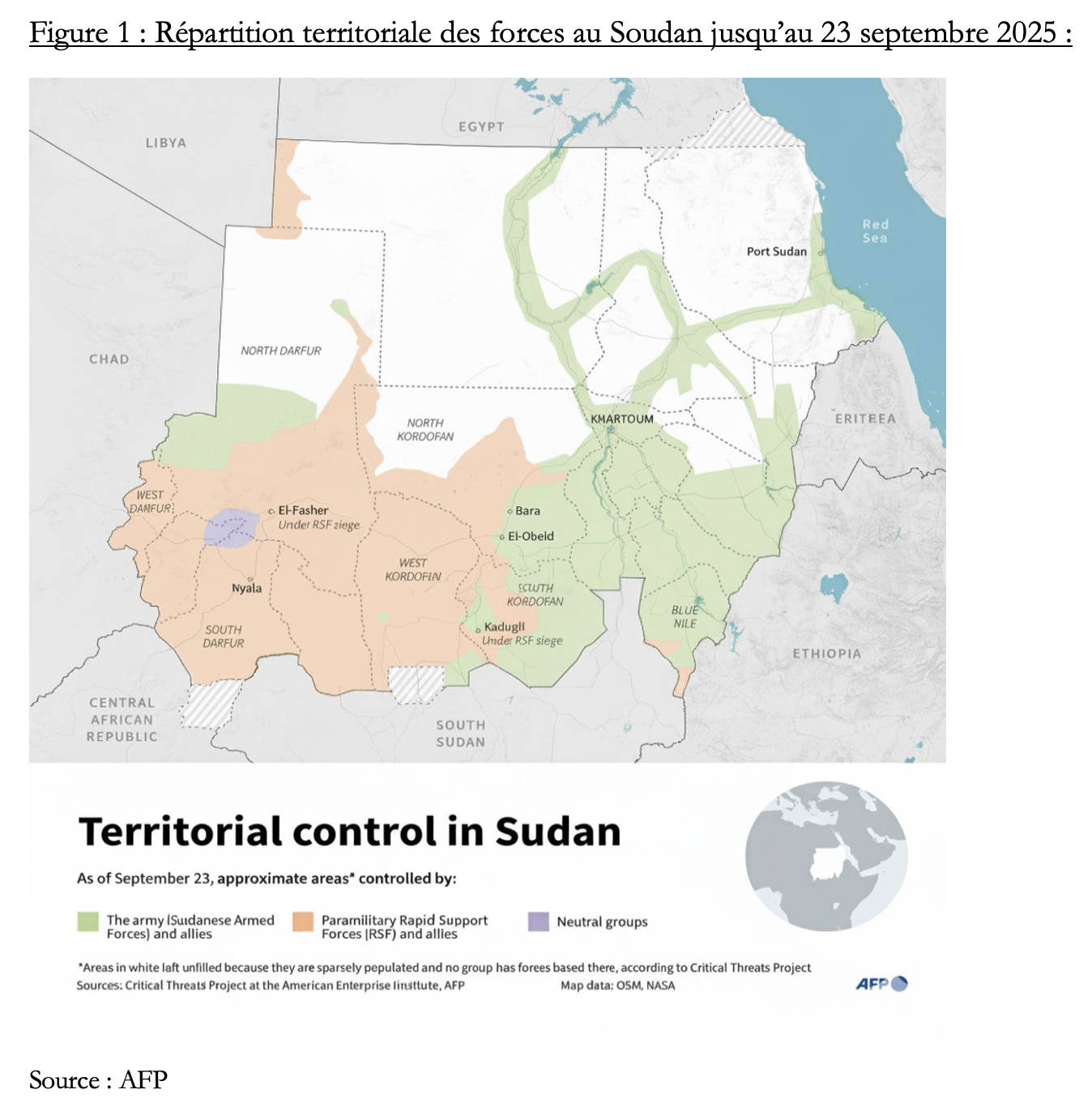 La guerre oppose l’armée régulière, les Forces Armées Soudanaises (FAS), dirigée par Abdel Fattah al-Burhan, aux Forces de Soutien Rapide (FSR) de Mohamed Hamdan Dagalo, dit Hemedti. Les FAS contrôlent certaines parties du nord et de l’est du pays, y compris le port stratégique de Port-Soudan, tandis que les FSR dominent le Darfour et une partie du Kordofan. Dans ce contexte de guerre, le patrimoine culturel est exposé aux pillages et aux destructions. Les musées, les bibliothèques et les sites historiques sont devenus des cibles pour les belligérants qui les considèrent davantage comme une ressource économique que comme un héritage à protéger. La carte ci-dessous montre la répartition territoriale des forces au Soudan.