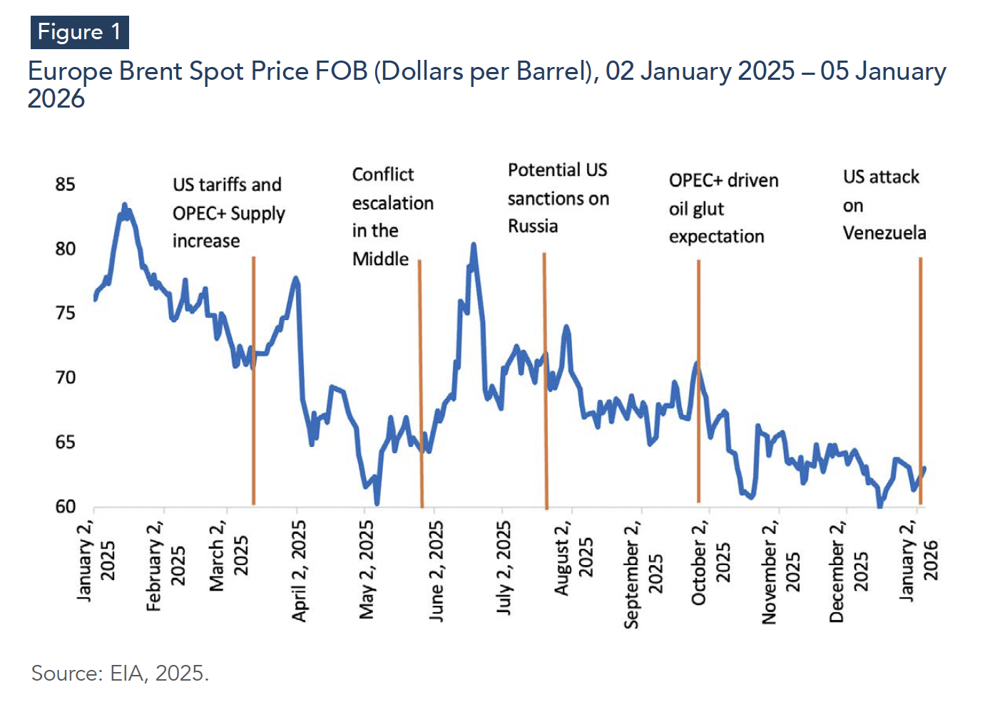 Crude oil prices declined markedly over 2025, reflecting a looser market balance as demand growth moderated and supply continued to rise. Quarterly averages fell from 74.2 U.S. dollars per barrel (USD/bbl) in 2025Q1 to 62.1 USD/bbl in 2025Q4, with only brief mid-year rebounds. Consistent with this trajectory, each quarter of 2025 remained below its 2024 level. On an annual basis, crude prices declined by 14%, from 78.7 USD/bbl in 2024 to 67.4 USD/bbl in 2025, reinforcing the shift from the tight conditions of 2022-2023 toward a surplus-leaning regime. Furthermore, although prices temporarily rebounded at several points during 2025 amid heightened geopolitical tensions, these episodes did not translate into a sustained reversal of the downward trend. Daily data therefore suggest that short-lived risk premia were insufficient to counteract the broader easing in market fundamentals (Figure 1).