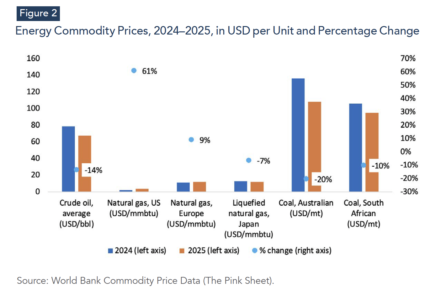 Unlike oil, the natural gas outlook for 2026 is governed by regional benchmarks linked imperfectly though LNG trade. Under the World Bank’s baseline, the U.S. benchmark is projected to rise by 11% in 2026 following a sharp increase in 2025, reflecting tighter domestic balances and higher LNG exports. By contrast, the European benchmark is projected to decline by 11% in 2026 after rising in 2025, as demand remains moderate and global LNG availability improves. Japan’s LNG benchmark is expected to broadly track European pricing conditions, reflecting continued competition for flexible LNG cargoes (World Bank, 2025).