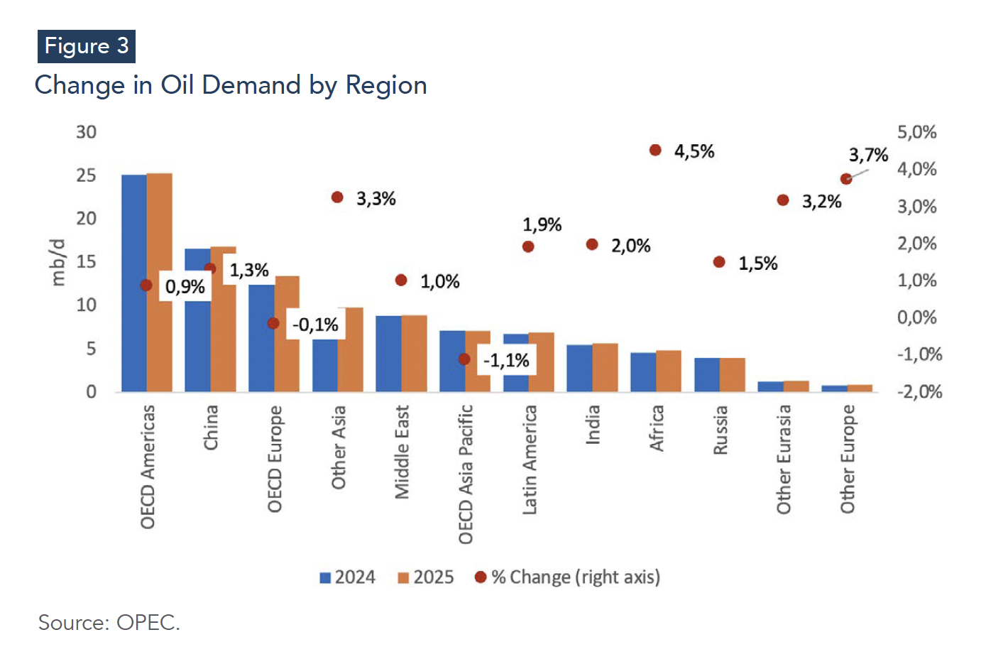 Beyond aggregate growth, demand gains are concentrated in non-OECD economies, while OECD consumption is broadly stable (Figure 3). OPEC’s regional breakdown shows modest growth in OECD Americas (+0.9%), offset by slight declines in OECD Europe (-0.1%) and OECD Asia Pacific (-1.1%), confirming the stagnation of demand in mature markets (OPEC, 2025). In contrast, non-OECD regions account for the bulk of the incremental demand. China remains a major contributor, though its demand growth is increasingly constrained by the rapid uptake of electric and hybrid vehicles, while India continues to expand steadily (+2.0%) alongside strong gains in Other Asia (+3.3%), the Middle East (+1.0%), and Latin America (+1.9%). Demand growth in Africa reaches 4.5%, making it one of the fastest-expanding regions, though from a low base (World Bank, 2025; OPEC, 2025). Therefore, 2025 is a year in which oil demand grows, but at a pace too moderate to absorb supply expansion, contributing to a looser market balance and reinforcing downward price dynamics (World Bank Group, 2025).