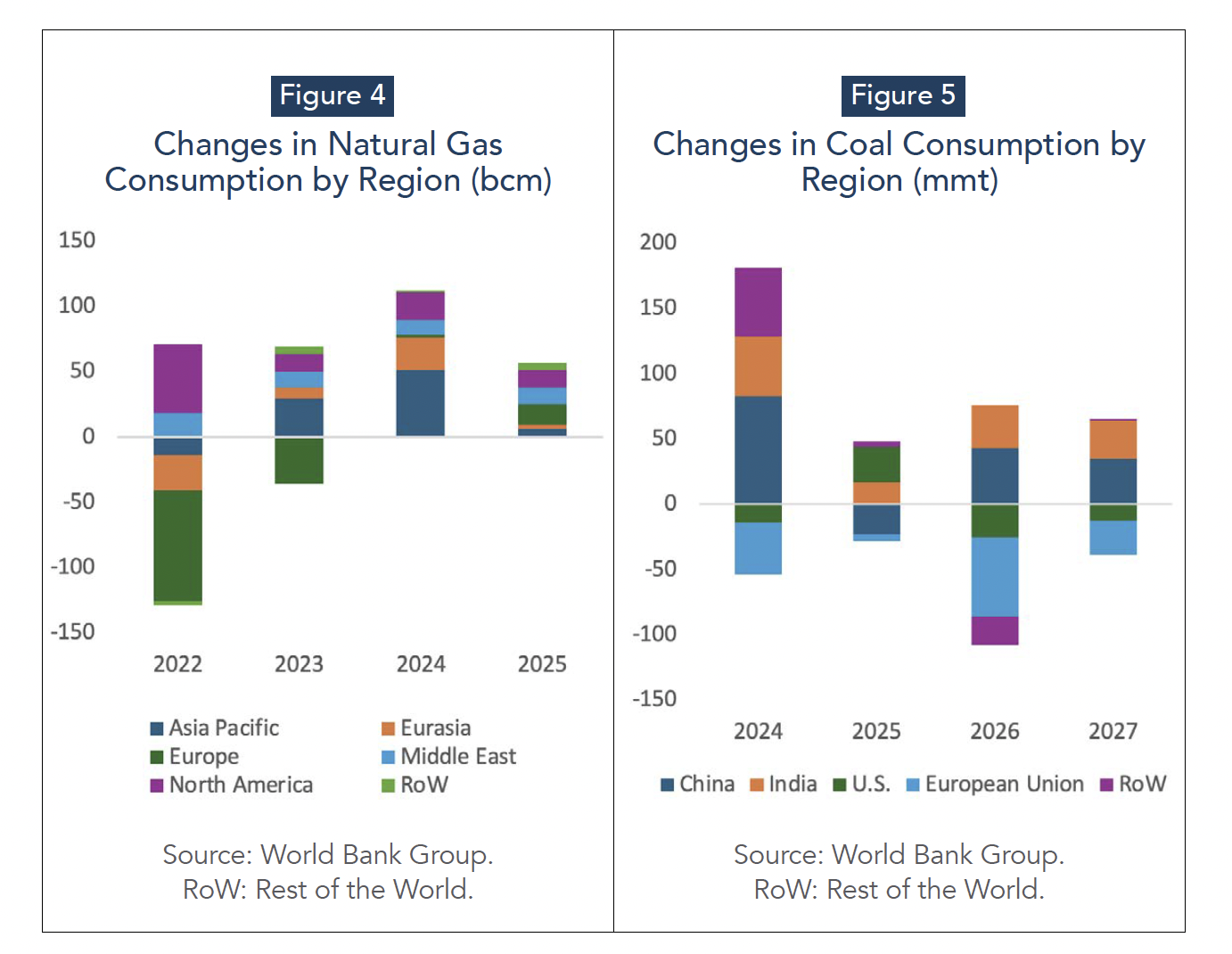 Natural gas demand displays sharper regional divergence in 2025, with weather and power-sector balancing needs dominating short-term consumption patterns. In the first half of 2025, demand rose in Europe and North America, driven by colder-than-normal temperatures in North America and a weather-related decline in renewable electricity output in Europe, both of which lifted gas-fired power generation. By contrast, demand in Asia Pacific, particularly China and India, fell during the first half of 2025 as industrial and refining consumption weakened and renewable output strengthened, consistent with the decline in China’s LNG imports over eleven consecutive months through September 2025 (World Bank Group, 2025). Despite these divergences, the World Bank projects that global gas consumption will rise in 2025 to about 4,270 billion cubic meters (bcm), an increase of around 1.4%. In the World Bank regional breakdown, net demand growth in 2025 (+57 bcm) is led by Europe (+16 bcm) and North America (+13 bcm), indicating that the market remained driven by short-term weather variability, regional fuel-switching dynamics, and LNG market conditions rather than uniform structural demand growth (Figure 4).