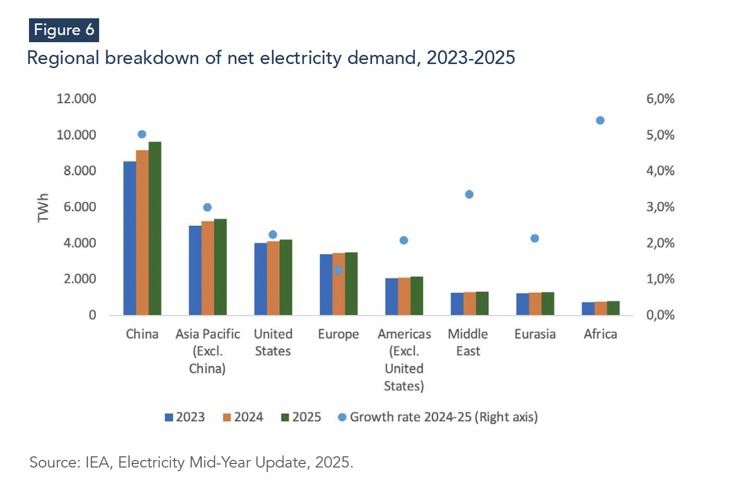 Electricity remains the most dynamic component of global energy demand. Global electricity consumption is projected to increase by 3.3% in 2025, down from the 4.4% surge in 2024, but still well above the 2015-2023 average of 2.6% (IEA, 2025b). Growth continues to be supported by structural drivers, including rising cooling needs, expanding appliance ownership, ongoing electrification, and the rapid expansion of data centers and AI-related computing loads. China contributes nearly half of global electricity demand growth, with consumption rising by 5% in 2025 after a 7% increase in 2024. India’s electricity demand is projected to grow by 4% in 2025, supported by rising temperatures and continued electrification. In advanced economies, growth remains positive but more moderate: U.S. demand is expected to rise by 2.3%, supported by data centers and new industrial loads, while electricity consumption in Europe grows by 1.1% (Figure 6) (IEA, 2025b).