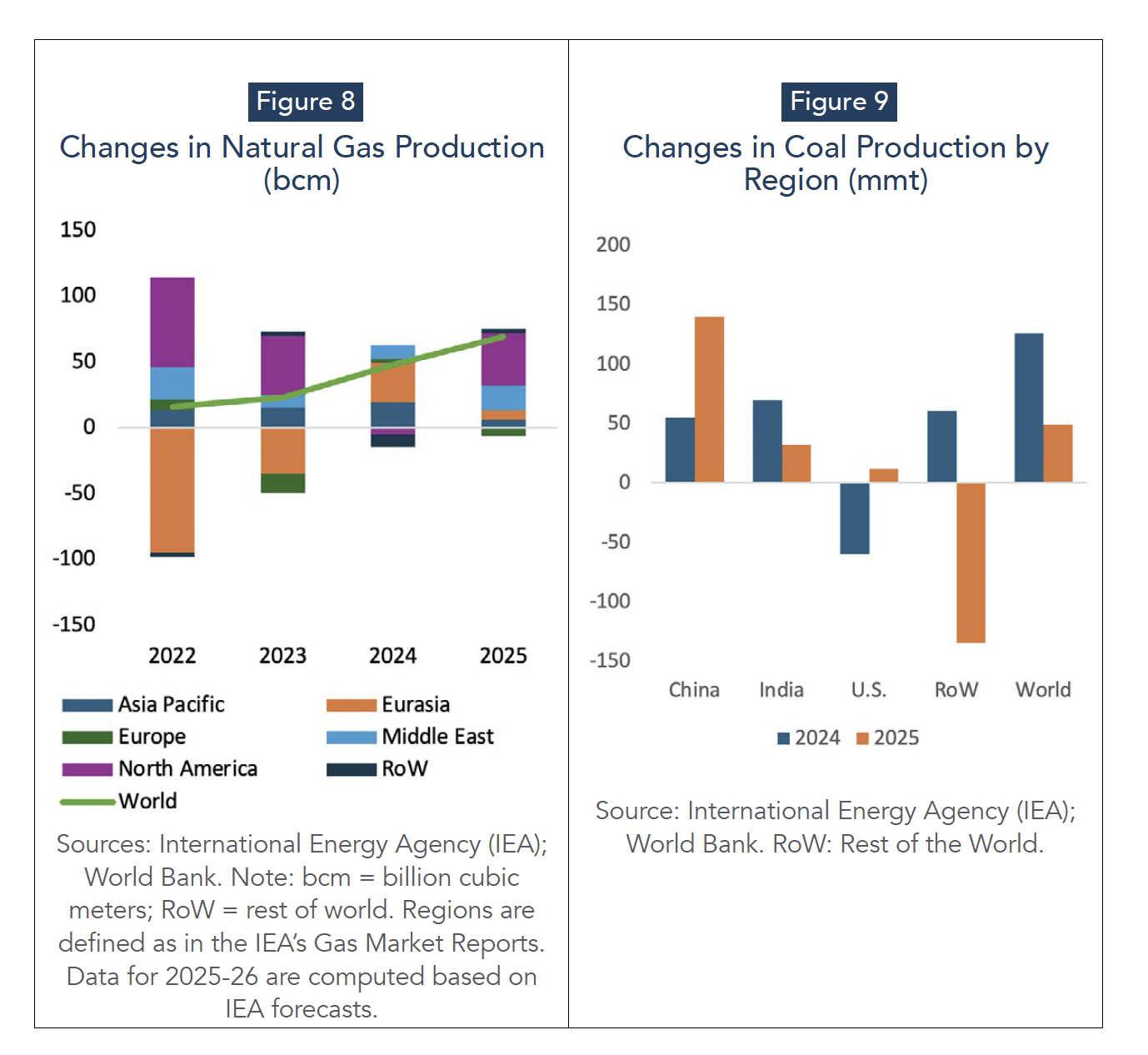 Coal supply dynamics in 2025 suggest that the market adjustment is driven less by demand collapse than by highly uneven regional supply changes. Global coal production is projected to increase by 49 Mt, but this net gain is concentrated in a few producers (Figure 9): China alone contributes +140 Mt, while India adds +32 Mt and the United States +12 Mt. These increases are more than offset elsewhere by a sharp contraction in the rest of the world (−135 Mt), consistent with supply constraints and disruptions affecting key exporters and reduced output in sanctioned producers (World Bank Group, 2025). The result is that global coal supply remains broadly expansionary despite flattening demand, reinforcing downward pressure on international prices and increasing risks for higher-cost exporters. Meanwhile, coal use in power generation continues to diverge by region, declining in China and India with stronger renewable output, but rising in the United States and parts of Europe amid higher gas prices and weaker renewable generation (World Bank Group, 2025).