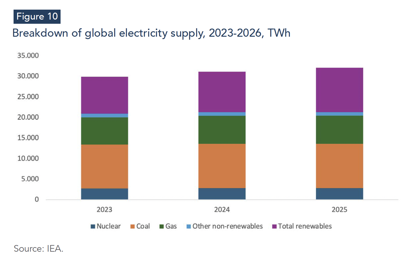 The generation mix continues to shift decisively toward low-emissions sources. According to the IEA, solar PV and wind are expected to raise their combined share of global electricity generation to nearly 20% by 2026, up from around 15% in 2024 (IEA, 2025b). Over the same period, coal-fired generation is projected to contract by 1.3%, while gas-fired generation continues to grow modestly—also by around 1.3% in 2026—reflecting the persistent need for dispatchable capacity to ensure adequacy and system balancing (IEA, 2025b). Nuclear output is likewise expected to rise further, approaching 3,000 TWh by 2026 (IEA, 2025b).