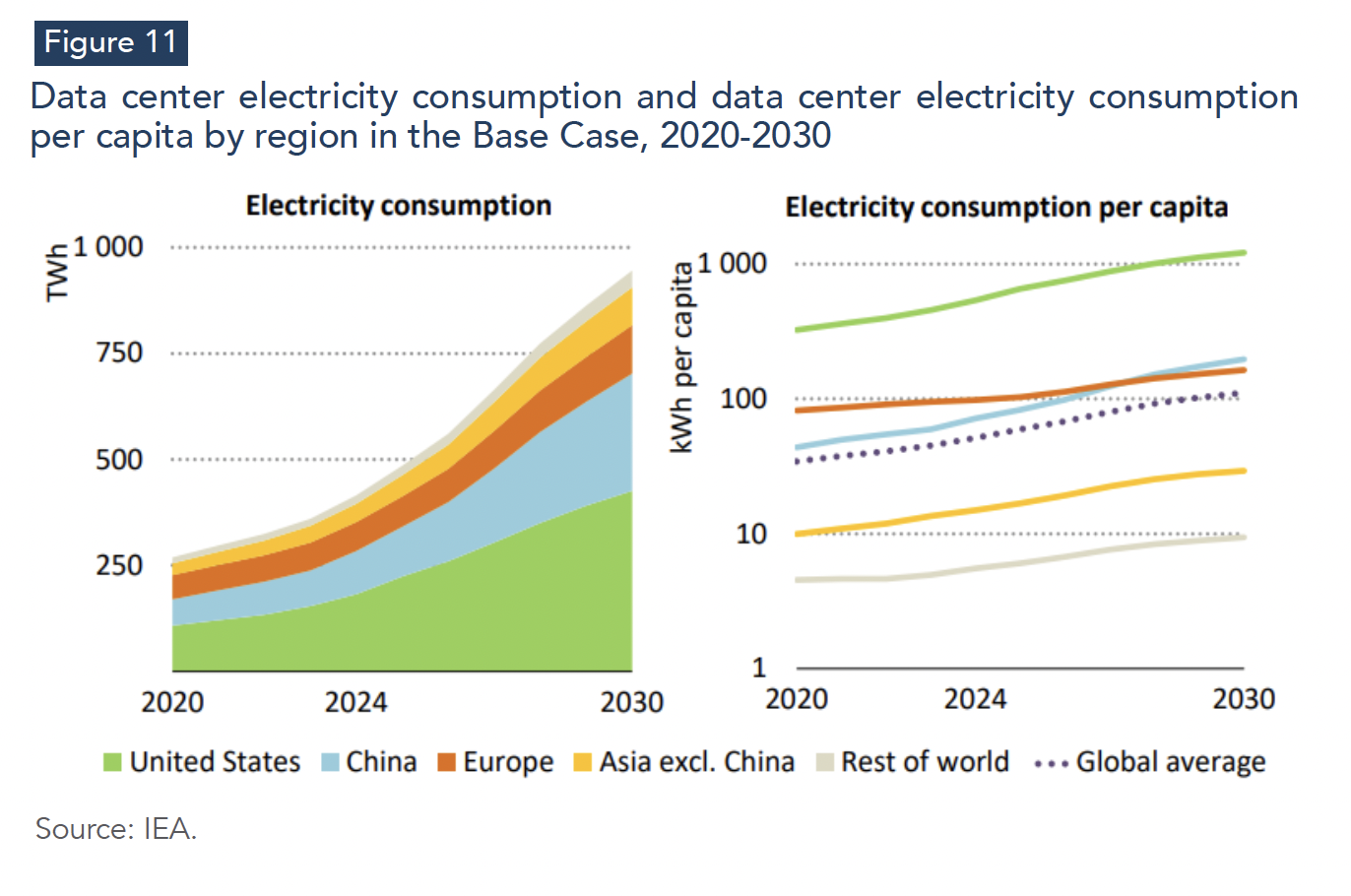 The acceleration is visible in recent demand dynamics. The IEA estimates that global data-center electricity consumption grew at around 3% annually during 2005–2015, then accelerated to around 10% annually during 2015–2024, reflecting the expansion of cloud services and, increasingly, AI-related workloads (IEA, 2025d). In 2024, data centers consumed roughly 415 TWh globally (about 1.5% of global electricity demand), with the United States alone accounting for around 180 TWh, nearly 45% of the global total (IEA, 2025d). Looking forward, projections vary across sources, partly due to uncertainty over utilization rates, definitional differences, and the treatment of on-site generation. Yet even conservative scenarios imply a sharp step-up from the 2024 baseline, consistent with the ongoing wave of new capacity announcements and hyperscaler investment plans (Wood Mackenzie, 2025; Gartner, 2025).